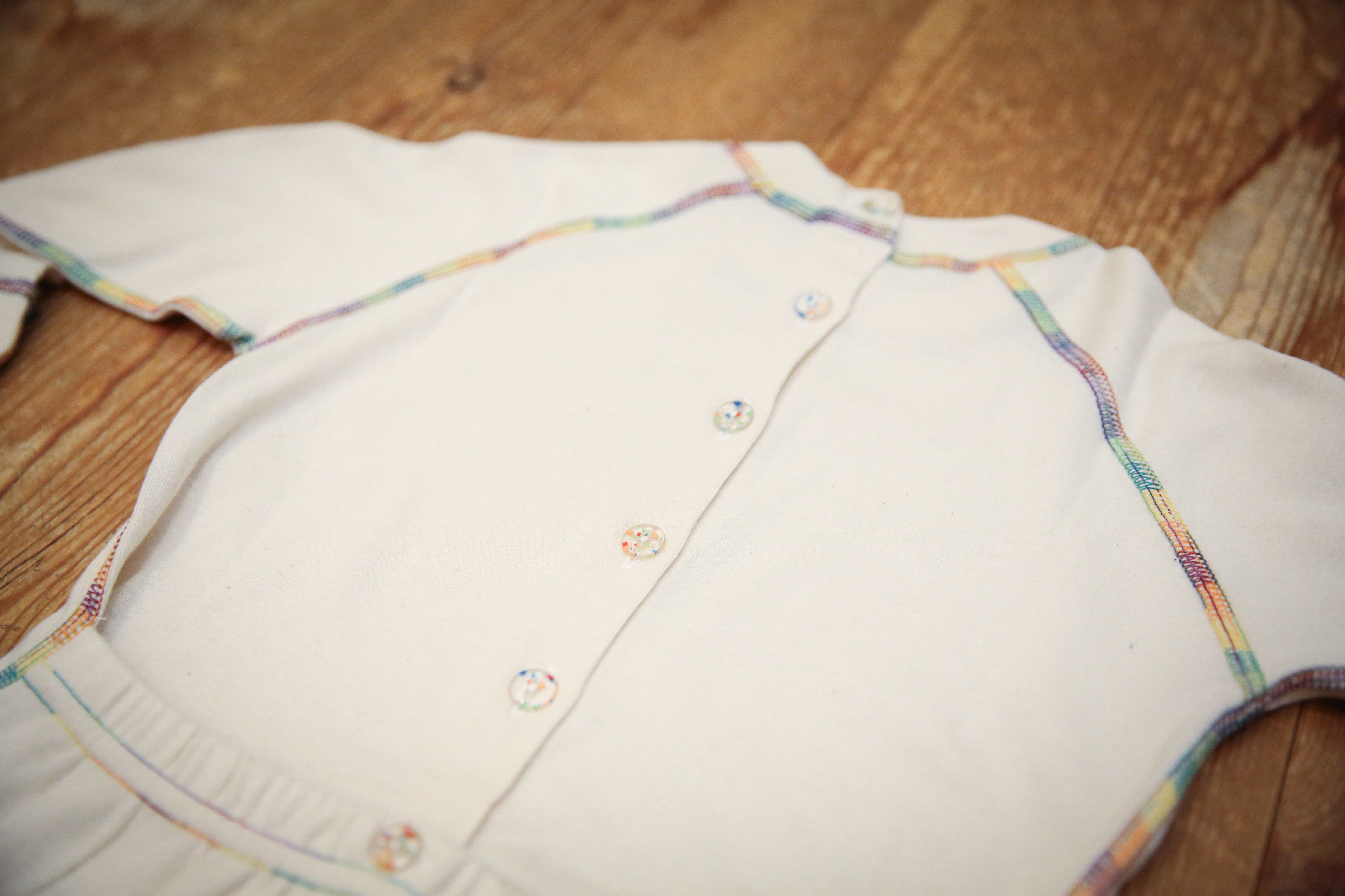 後ろは上半身の背中にかわいいボタンがついていて、腰の部分はやさしいゴム仕様。背中の最後のボタンはそのゴムの背中の生地と留めてあげますので、背中が出て来てしまう心配もありません。縫い目はすべてシームレス。肌への刺激となるケミカルを使わないオーガニックのコットンを使うという素材から、その縫製まで、とにかく肌に負担を掛けないデザインが徹底されています。