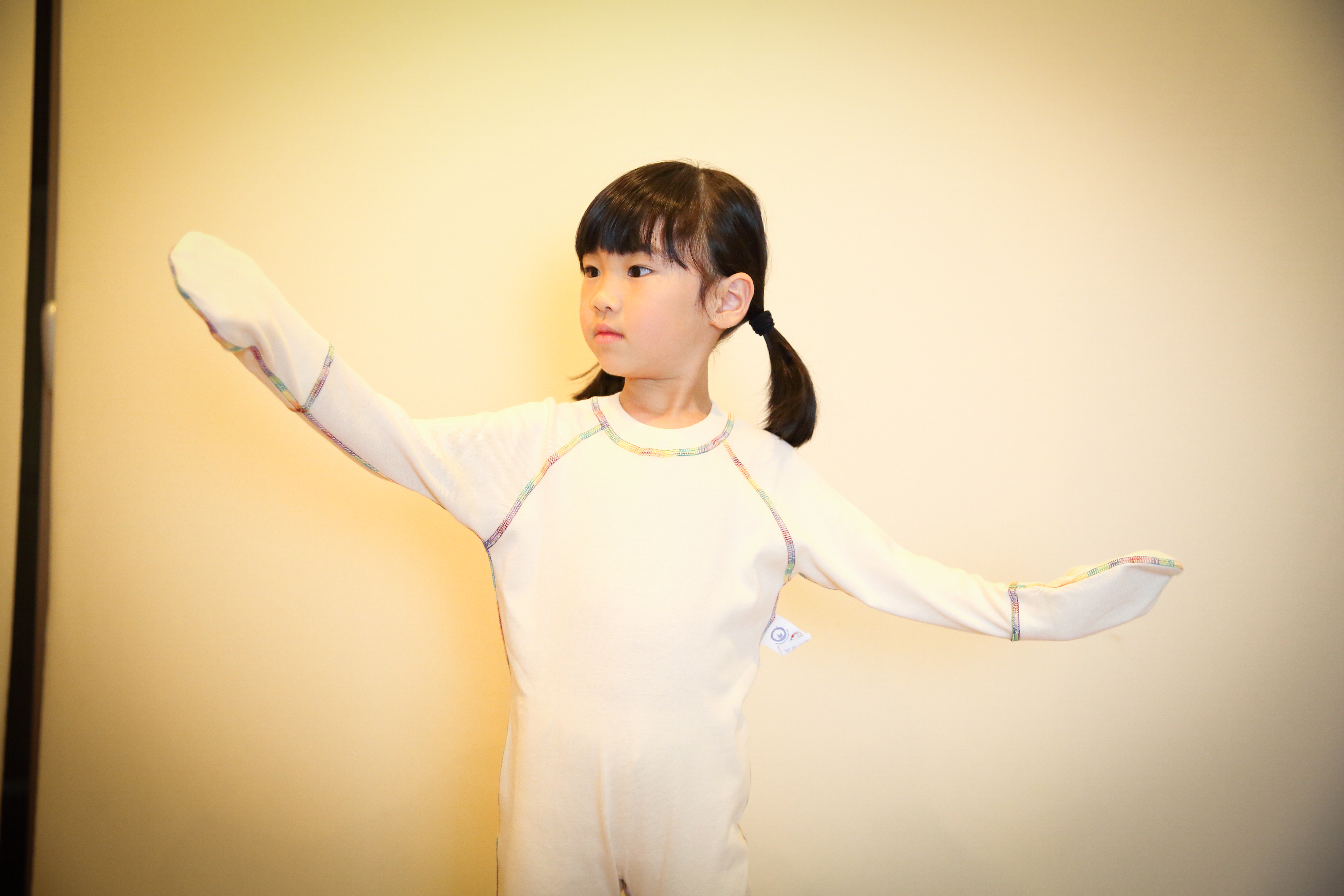写真からもわかるように、腕の部分のデザインはゆったりめになています。手のひら部分の手袋も、手をパーしても余裕があります。