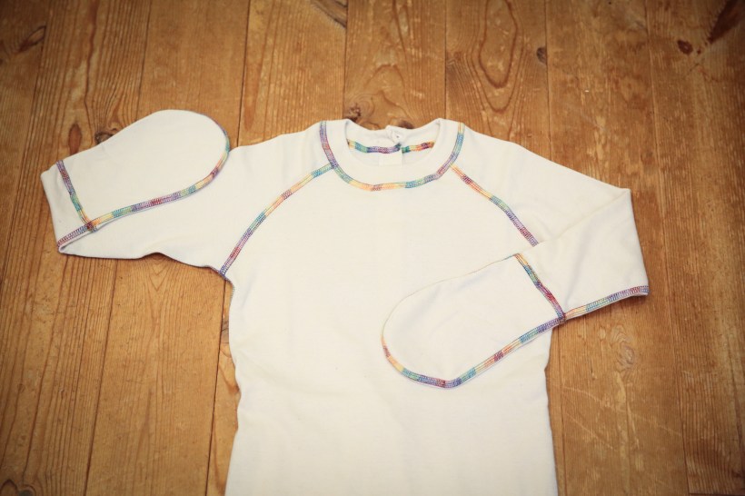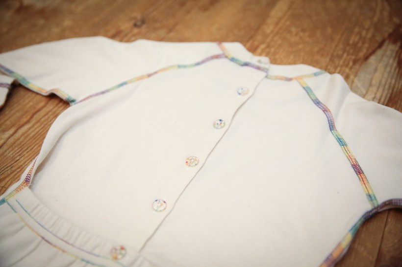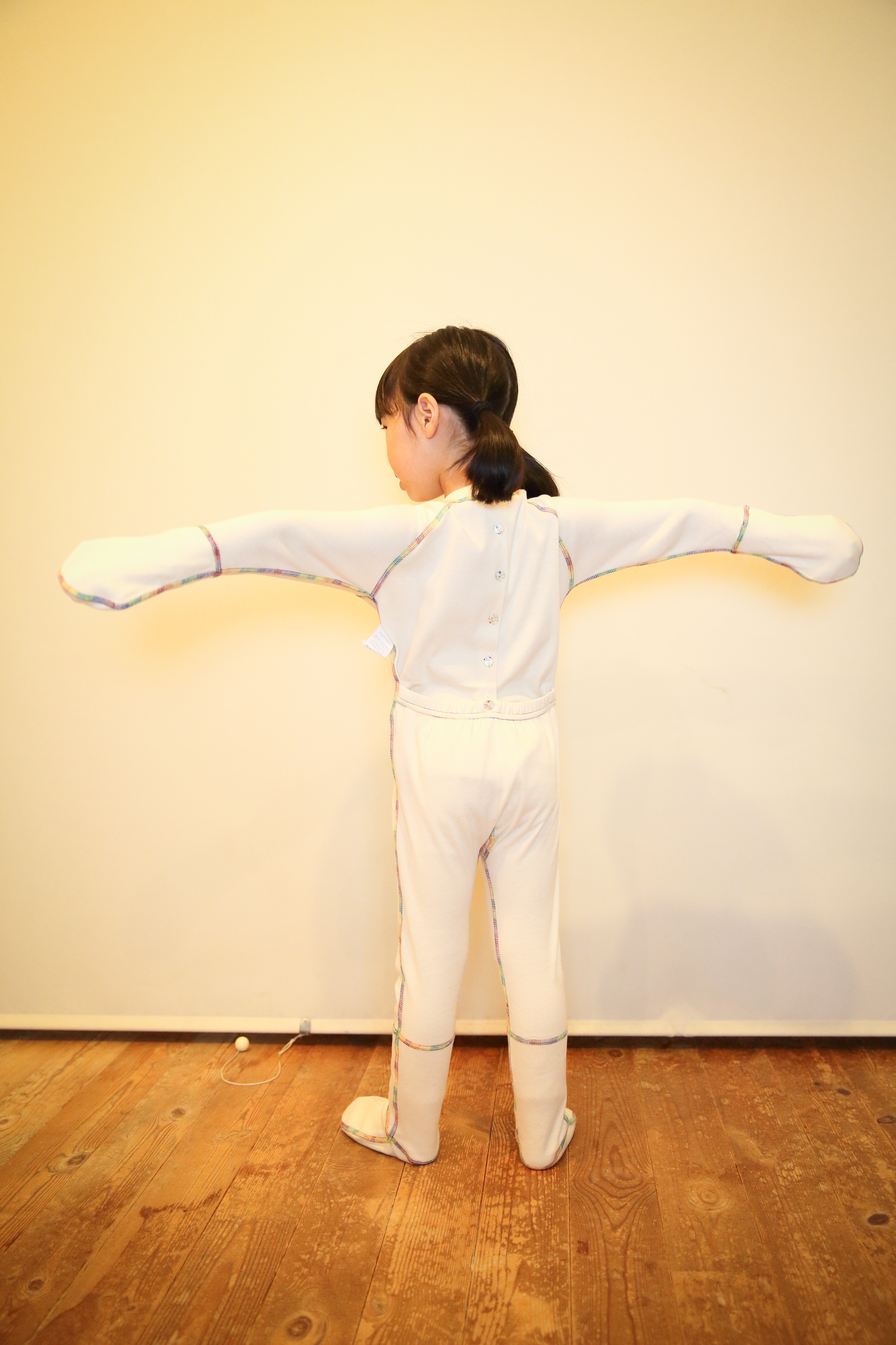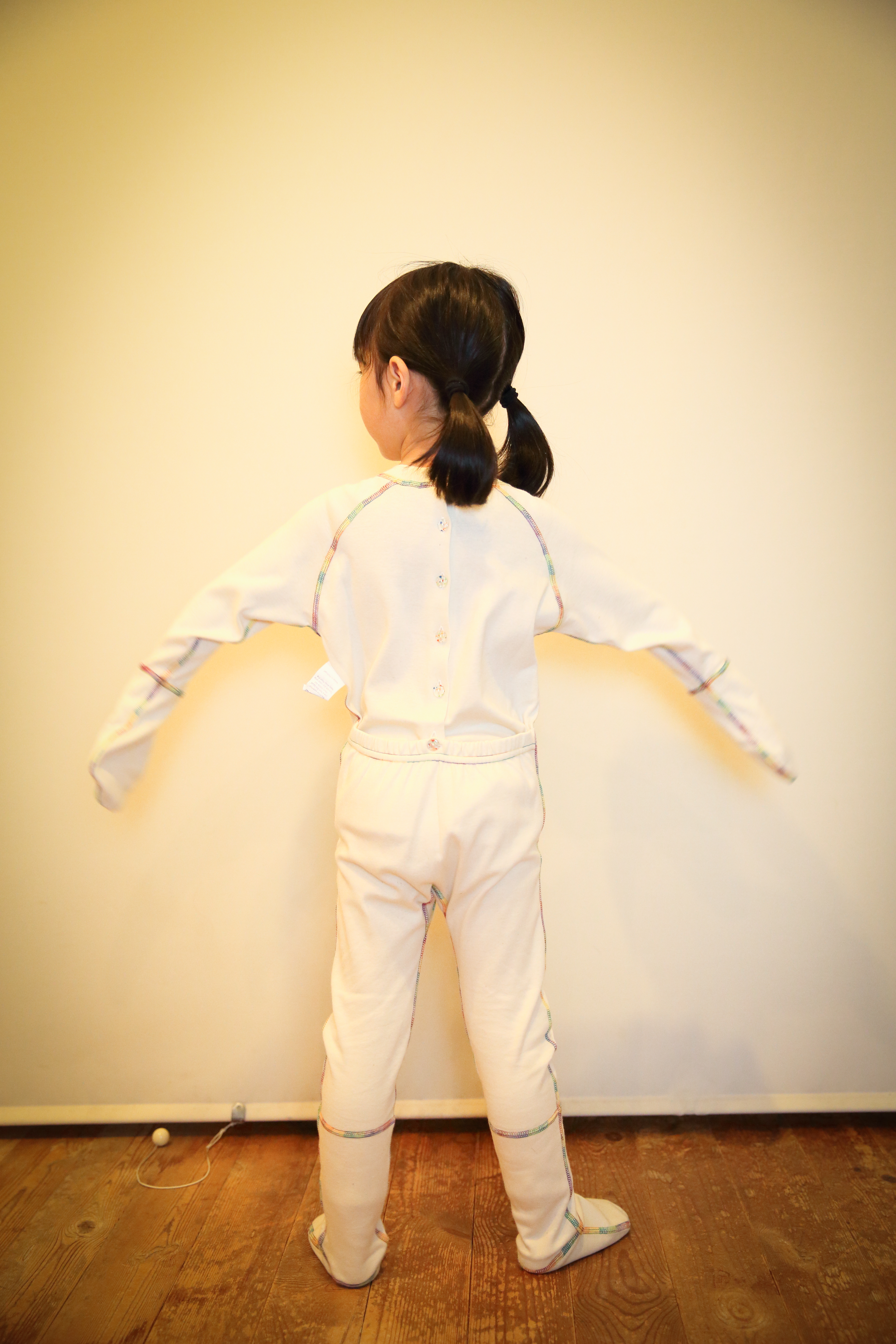 ズボンの背中部分はゴムが入っています。腕と足の先にステッチが入っているのは、そこから先が生地が二重になっているからです。